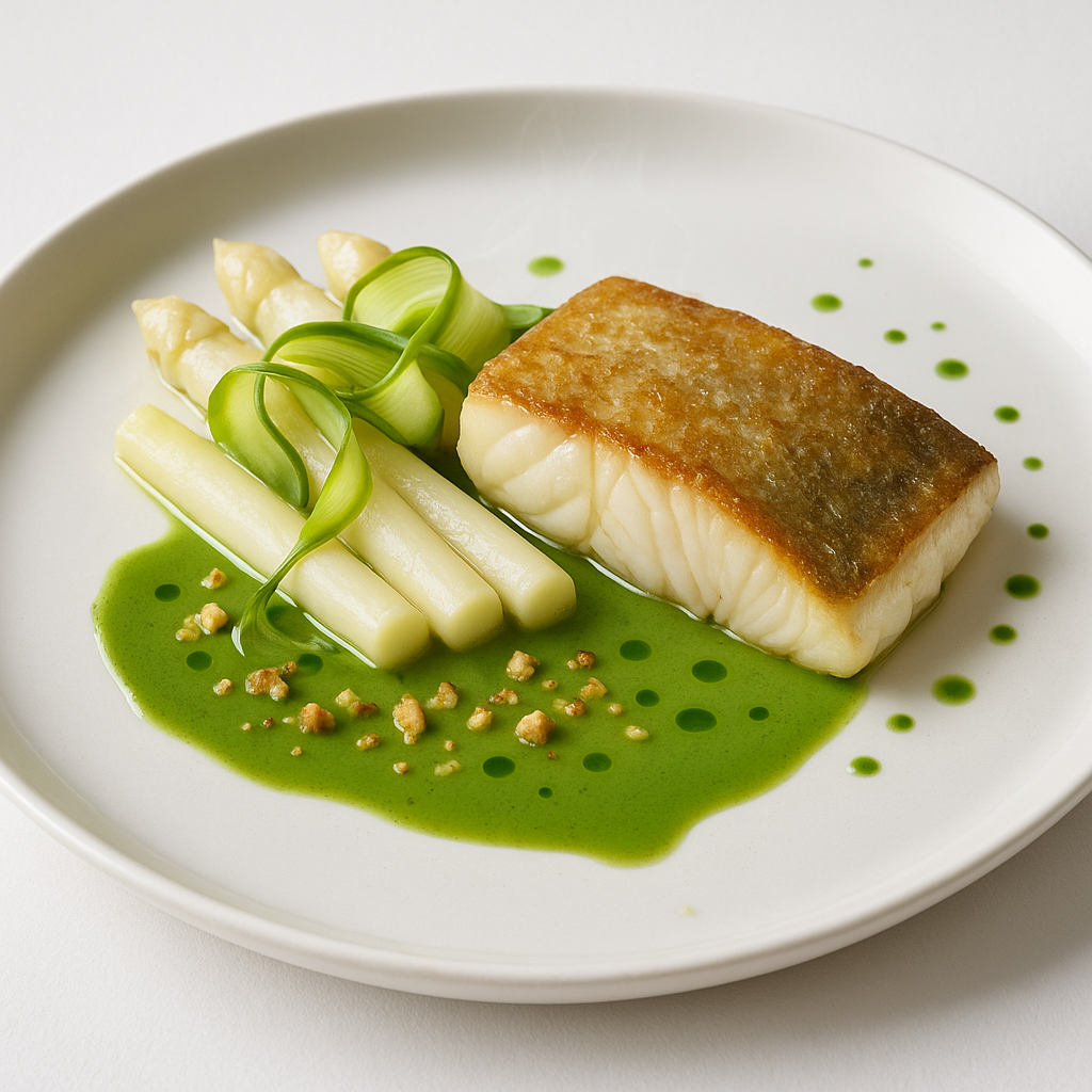 Kulinarik Steinbutt mit jungem weißem Spargel, Bärlauch-Buttermilch-Velouté und Haselnuss Ein frühlingshaftes Signature Dish mit klarer Idee: perfekt glasig gegarter Steinbutt…